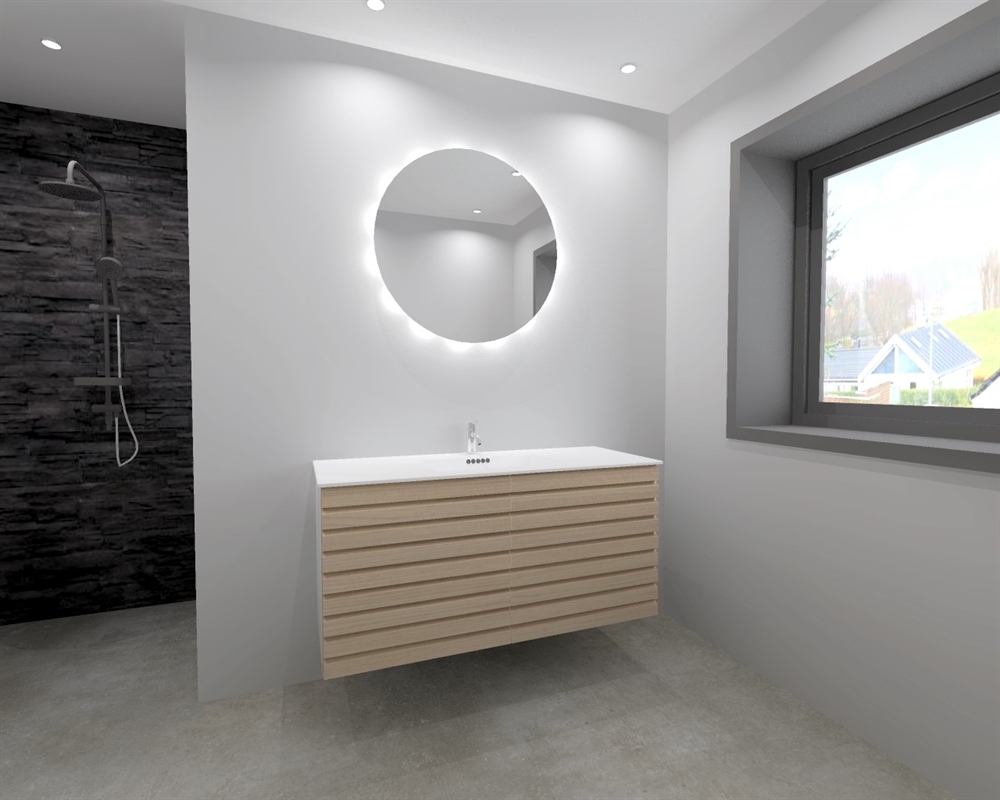 Badsættet er konstrueret af massive 16 mm tykke lameller i hvidolieret eg, der giver et naturligt og varmt udtryk, samtidig med at det sikrer en lang holdbarhed og stabilitet. Det smukke Washington Eg i naturfarve fremhæver træets unikke åretegninger, hvilket giver en ægte skandinavisk følelse, der bringer naturen ind i dit hjem. Hver eneste detalje i designet er gennemtænkt; de eksklusive fronter har et grebsfrit design, hvilket både tilføjer en moderne nuance og gør badsættet nemt at rengøre. Man opnår en strømlinet, minimalistisk stil, der er ideel til den moderne bolig.